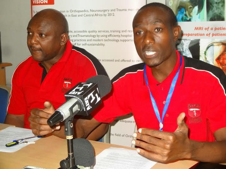 Meneja Ustawi wa Jamii na Uhusiano wa Taasisi ya Tiba ya Mifupa, Upasuaji wa Ubongo na Mishipa ya Fahamu (MOI) Bw. Almas Jumaa akiwaeleza waandishi wa habari (hawapo pichani) jinsi Taasisi hiyo ilivyoendelea kuwa nguzo Muhimu katika kuokoa maisha ya watanzania ambapo upasuaji wa kitaalam wa mgongo umeendelea kufanyika na kufanikiwa kwa zaidi ya asilimia 99 na kusaidia kuwaondoa wagonjwa wenye tatizo hilo katika hatari ya kupotea uhai.Kulia ni Afisa Uhusiano wa Taasisi hiyo Bw. Patrick Mvungi. PICHA NA MAELEZO.